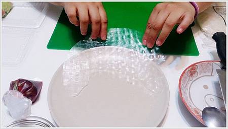 1. 準備一個平盤,裝冷開水,用來沾米紙皮,整張米紙都要充份的沾濕,它才會軟化唷!!